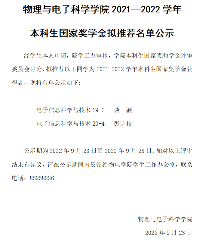 物理与电子科学学院2021—2022学年 本科生国家奖学金拟推荐名单公示