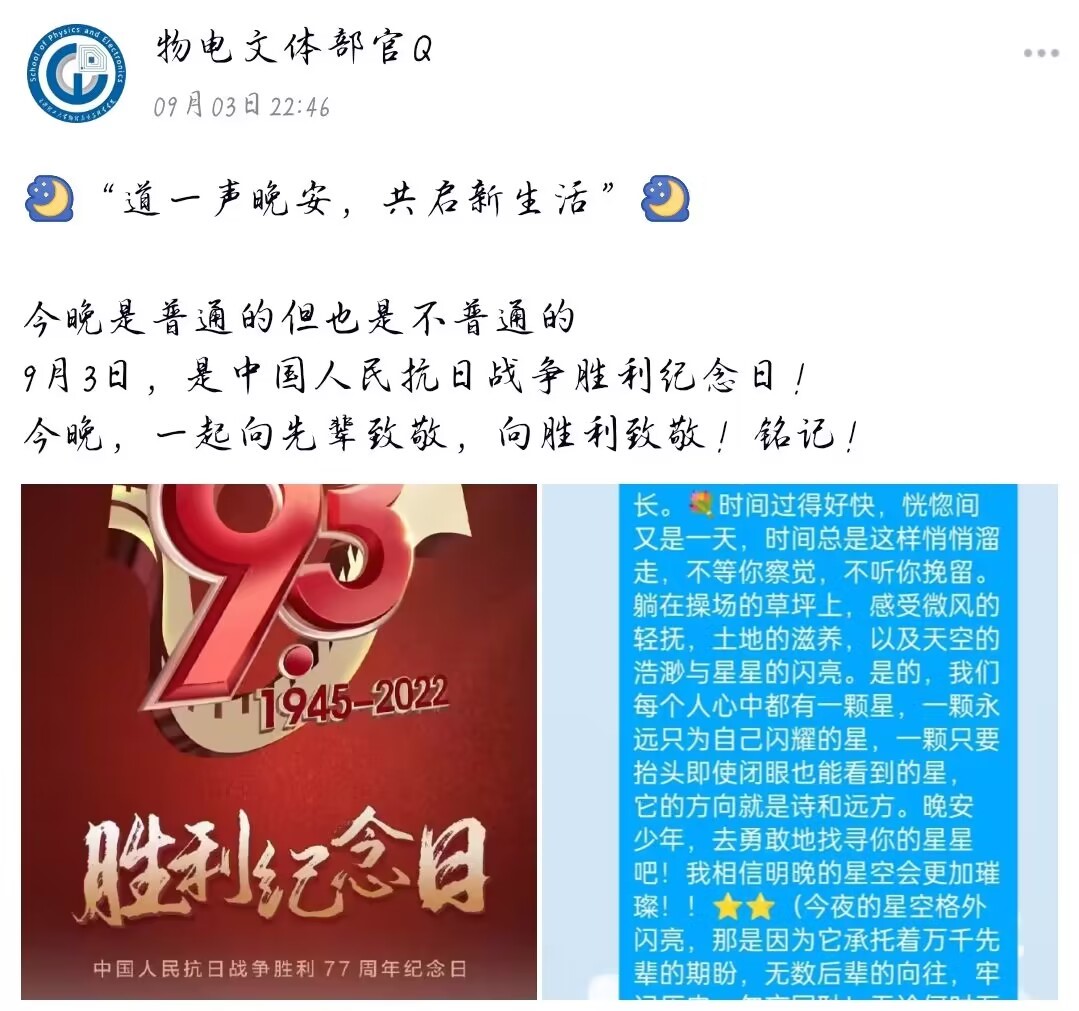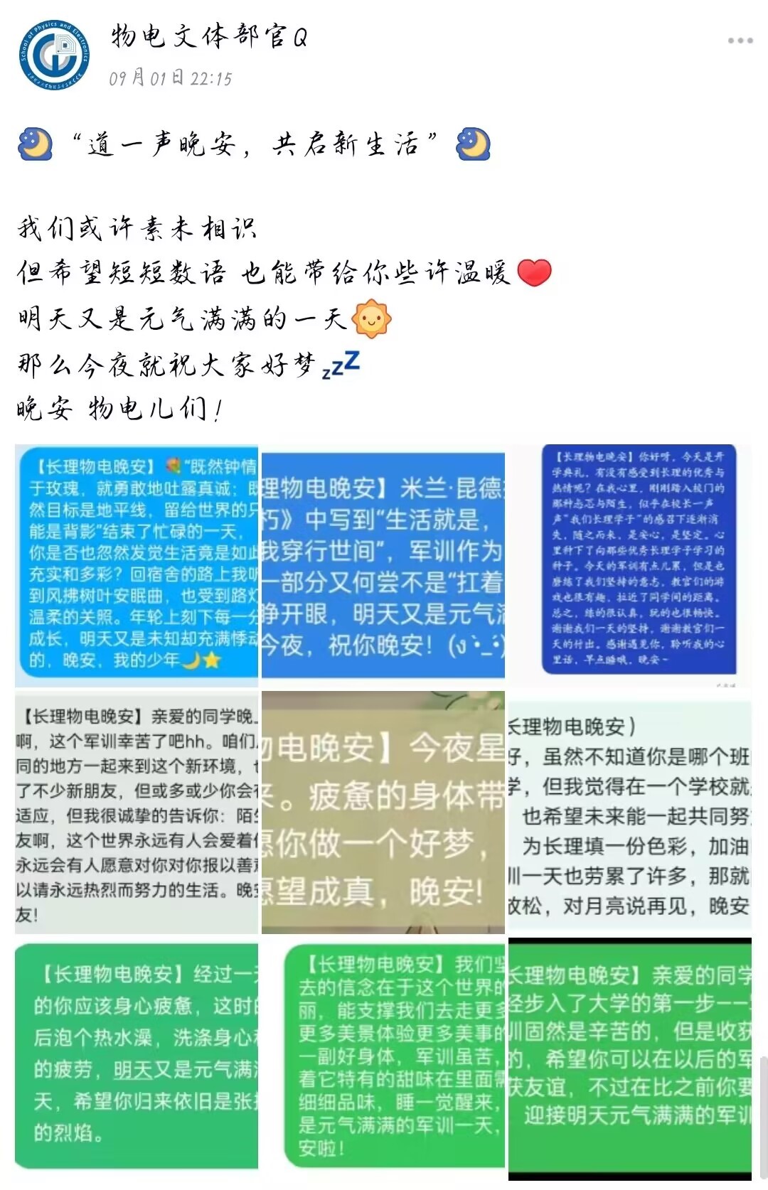 2022年8月31日~9月7日,物电学院于线上开展了“道一声晚安,共启新生活”晚安计划活动,众多22级新生选择参与了进来。