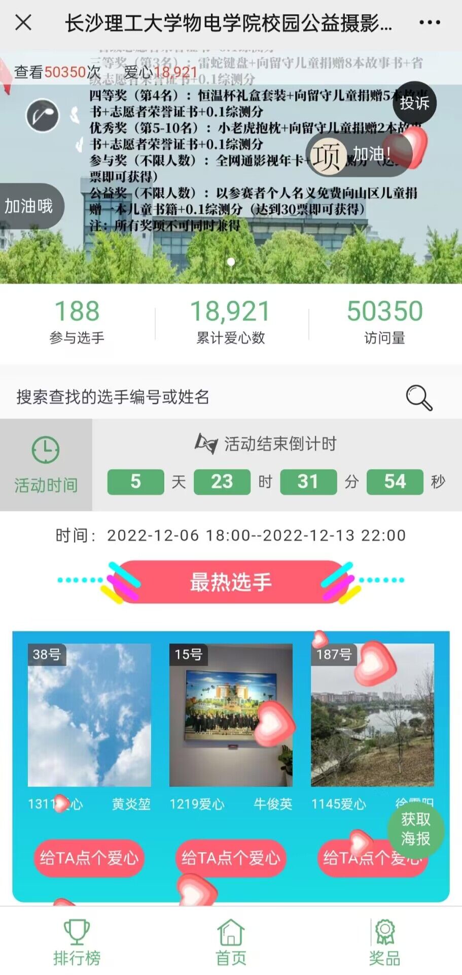 本次摄影大赛面向物电学院全体学生,大赛采取“我把校园风景拍给你看”校园摄影活动形式。参与活动的选手将作品上传至指定爱心集赞平台,通过传播获取爱心值为自己争取排名。根据作品集赞排名,活动前 10 名选手可获得丰厚奖品及相关荣誉证书,合作方将以参赛者名义向留守儿童捐赠儿童故事书。