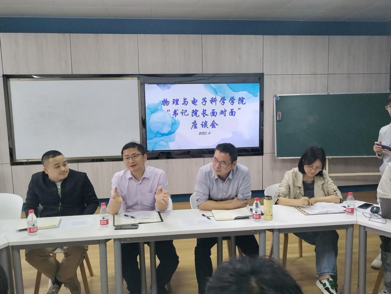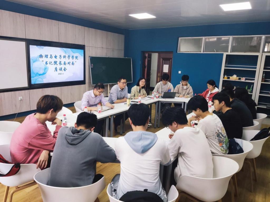 4月11日下午16点,物电学院“书记院长面对面”学生座谈会在理科楼C509举行。物电学院党委书记张国强、副院长(主持工作)张卫兵、年级辅导员赵俊程参加了座谈会,学院党委副书记宋国宁主持会议,参会的有2021级学生代表和学生会生活权益部成员。