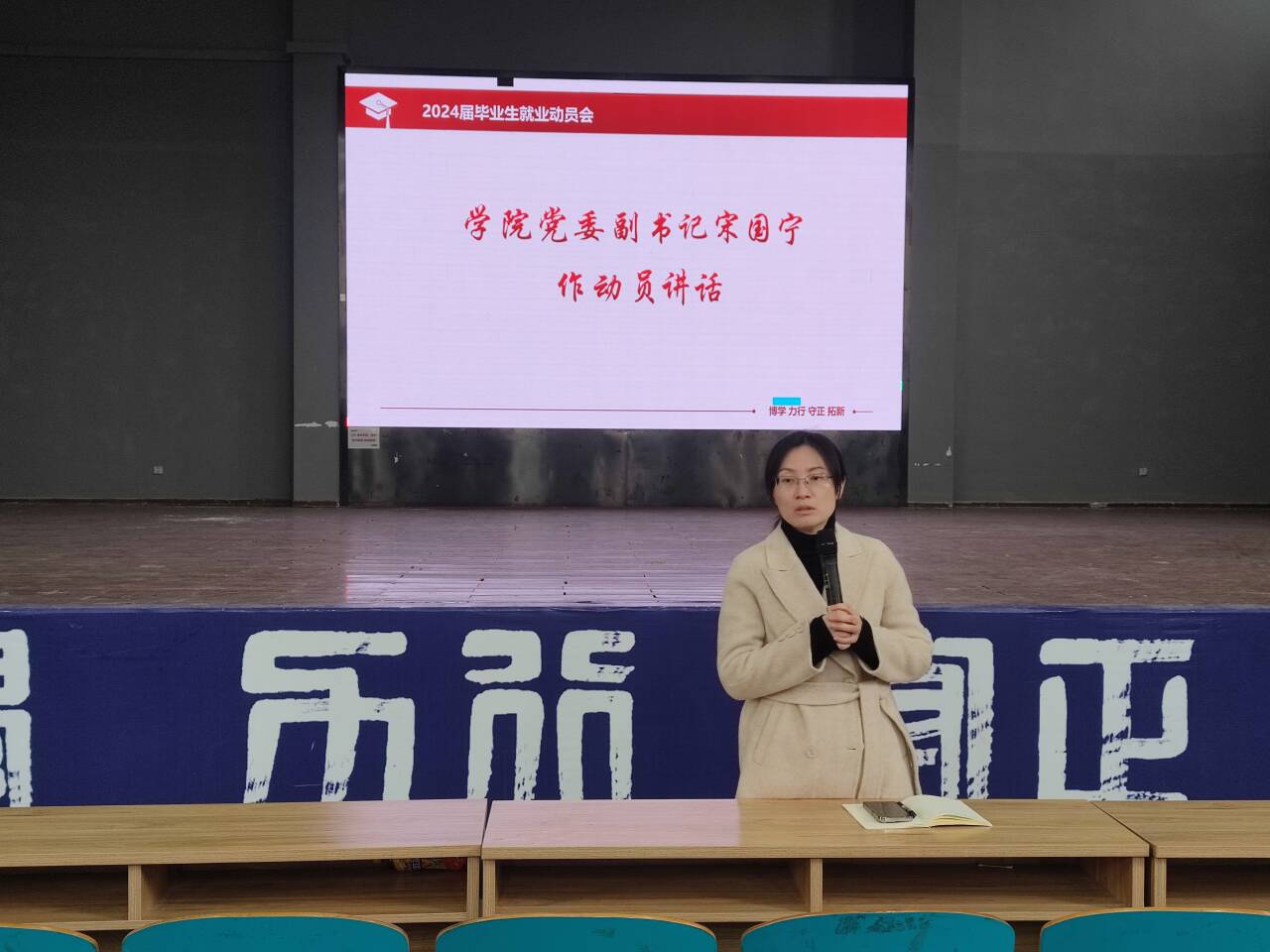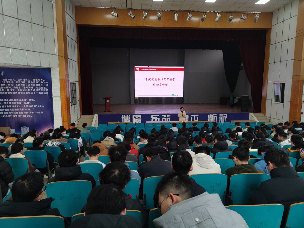 为全面推进落实学院2024届毕业生就业工作,引导毕业生树立正确的就业观念,提高就业积极性和主动性,2024年3月1日上午,学院在科技报告厅召开2020级本科生年级大会暨2024届毕业生就业再动员,学院党委副书记宋国宁出席会议, 2024届全体毕业生参加会议。会议由2020级辅导员郭晨鑫主持。