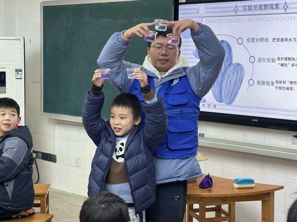 本次科普活动以花青素的酸碱指示为主题,由23级电信王子衡同学授课并展开,小朋友们被分为五组积极参与到活动中来。每个小组都有效且顺利的完成了实验目标,每位学生都对实验过程以及实验结果表现出了浓厚的兴趣。
