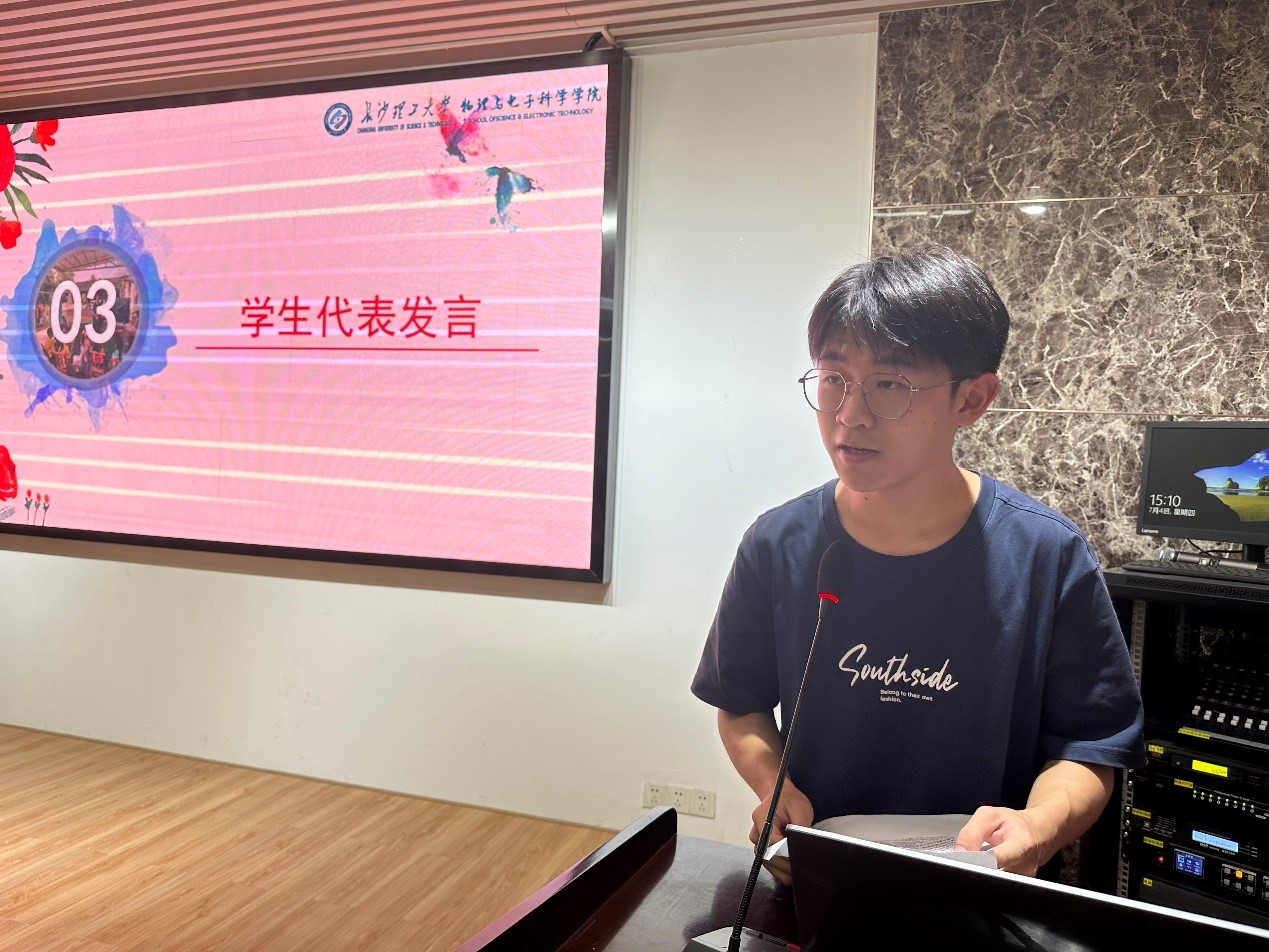 之后,两位学生代表电信2301班何旭和人智2302班侯智凯发言,他们表示,通过参与暑期社会实践,不仅能提高自己的团队协作能力和沟通能力,还能深刻感受到社会的发展变化和人民群众的需求,更加明确了自己的责任和使命,对本次暑期社会实践充满期待。