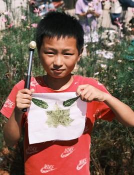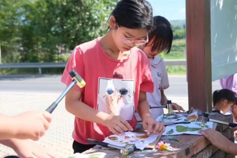 烈日之下,几十个小朋友在分散在田间,挥舞着胶头锤子卖力地敲击手下的植物。一片片叶片花朵被锤进纱布,留下清晰可见的叶脉。