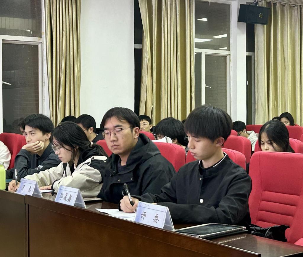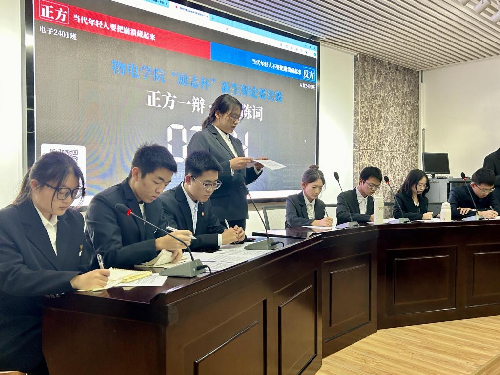 本次赛事由常玉祺主持,辅导员郭晨鑫出席此次赛事,物电学院辩论队成员易邦、唐慧雯、郑甲申担任评委。本次辩论赛的正方班级为电子2401班,反方班级为人智2402班。