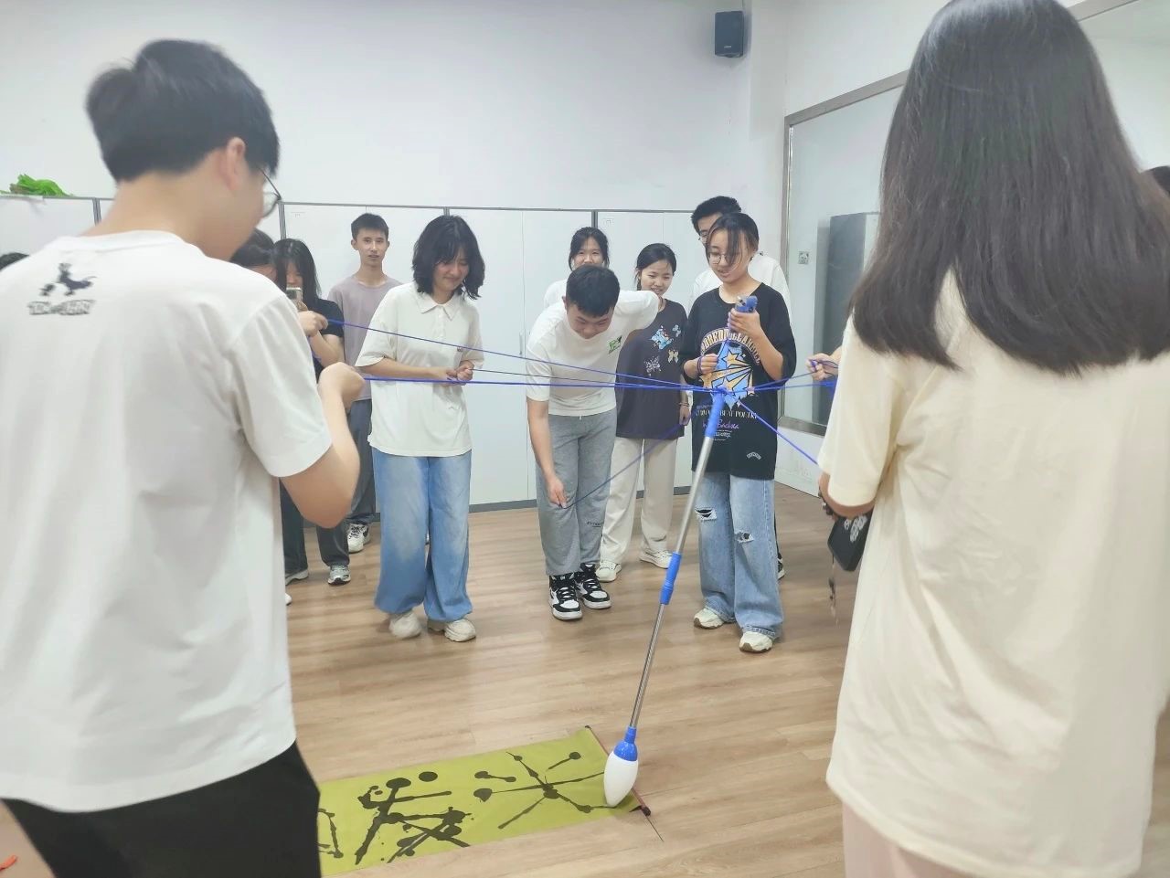 接下来是“神笔马良”游戏。游戏开始前,将团队成员分成多个小组,在地上放一张大白纸,所有队员拉绳子的末端,在不接触毛笔的情况下完成指定任务,小组内每人控制一根绳子,全部绳子绑着一根大毛笔,众人齐力控制大毛笔在卡纸上写字,参赛人员在控制绳子的过程中要拉住绳子的末端,不可触碰毛笔。整个游戏考验的事团队的协作能力,同学们都屏住呼吸,相互提醒,以求共同完成任务。