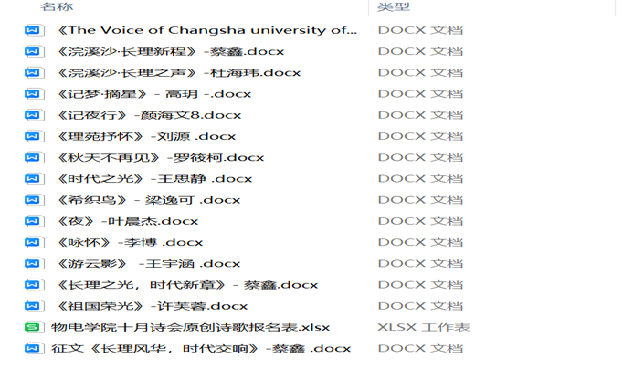 此次活动以“长理之声,时代之韵”为主题,面向全院所有同学开展,吸引了众多诗歌爱好者踊跃参与。活动根据文体的不同分为四个不同的组:古体诗,现代诗,外文诗歌和征文,最后从诗歌的主题内涵、艺术表现、语言运用等多个维度进行综合考量,评选出15份优秀作品代表学院参加校赛。