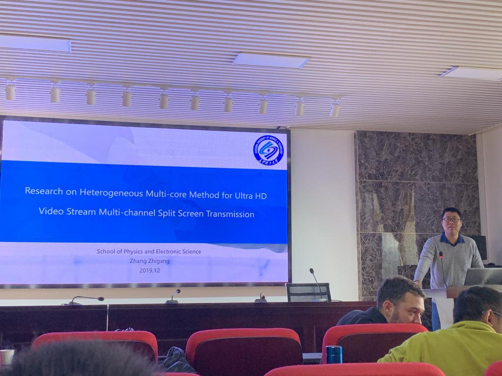 第三位做报告的是是我院在读博士研究生——张志刚,他进行了题为Research on Heterogeneous Multi-core Method for Ultra HD Video Stream Multi-channel Split Screen Transmission的学术报告。从当今人们对于视频显示的更大更高清的需求出发,提出他们课题组欲将视频数据分块传输至多块高清屏幕以维持图像的高清晰度,通过多块屏幕组合成大屏幕这一设想。
