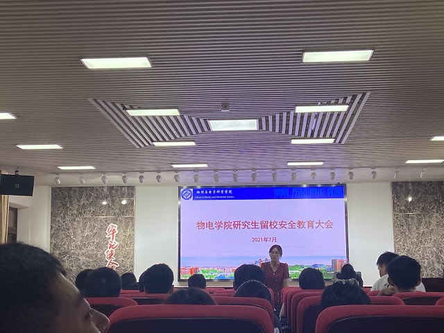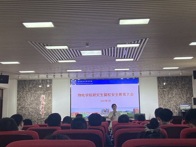 为帮助暑假留校同学了解留校管理安排,7月14日上午11点,物电学院在理科楼B413召开研究生暑假期留校安全教育大会。会议由研究生辅导员蒋琳嫒主持,院党委副书记宋国宁出席会议,全体留校研究生参加。