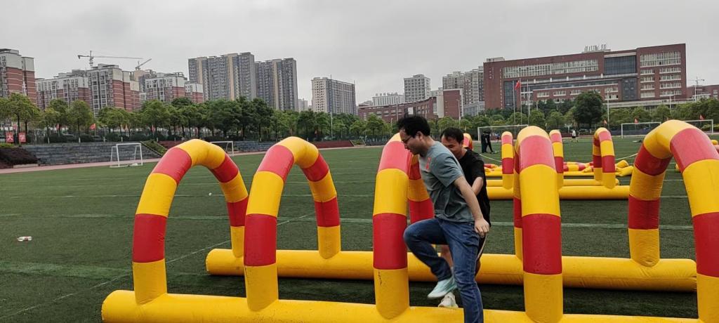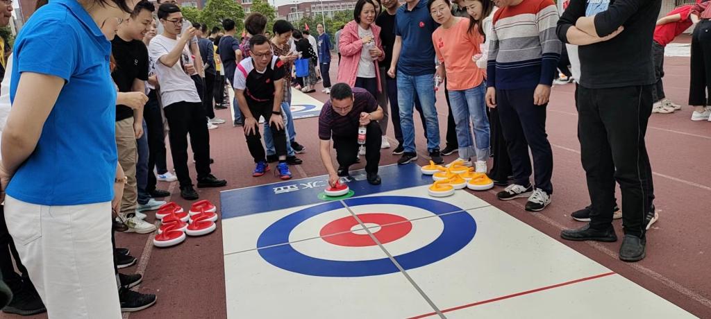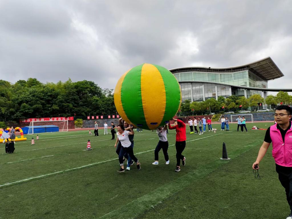 我院代表队在张国强书记的带领下参加了全部五个项目的比赛。大家一起托举起彩球喊着励志口号朝着终点线奋力冲刺;四个人合穿着连体裤步调一致,一路上磕磕绊绊、踉踉跄跄,在笑声中走完全程;两个人手牵手越过障碍,携手同行,合力将气球交到下一对选手手里,齐心合力,争分夺秒;旱地冰壶赛场大家斗智斗勇,用集体的智慧夺取最终胜利;三方拔河场地绳子时而被我们拉过来,时而又被别人拉过去,大家憋着一口气,直至一方倒地。大家在欢声笑语中完成比赛,收获了快乐,收获了友谊,锻炼了体魄,磨练了意志。