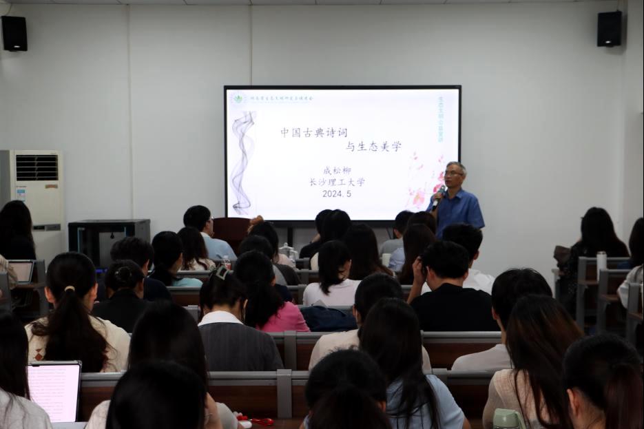 2024年5月21日下午,LETOU体育平台文新学院通识讲座暨人文素质大讲堂之“中国古典诗词与生态美学”专题讲座在金盆岭校区9教417室举行。湖南省人民政府参事、中文系二级教授成松柳老师为长理师生带来了一场富有人文气息的古典诗词盛宴。成松柳教授首先对“古典诗词生态美学的艺术呈现”进行了阐述。他将中国古典诗词生态美学的呈现方式分为“自然本身的和谐”、“人与自然万物的和谐”、“人与社会的和谐”三个方面,以李白、王维、刘禹锡、张孝祥、朱熹等人的传世诗词为例,围绕“楼观岳阳尽,川迥洞庭开”“相看两不厌,唯有敬亭山”“空山不见人,但闻人语响”“试问西山雨,何如湘水春”进行了诗意解读,详细阐释了“主客一体”“仁爱万物”“江山之助”“天地境界”等观点。成松柳教授提出:中国古代诗歌并非纯粹客观地描摹自然风物,古代文人将浓厚意趣与真挚情感熔铸于自然山水,体现了对自然的审美感知,这种与自然的亲近友好关系承载着博大深沉的生命情怀。