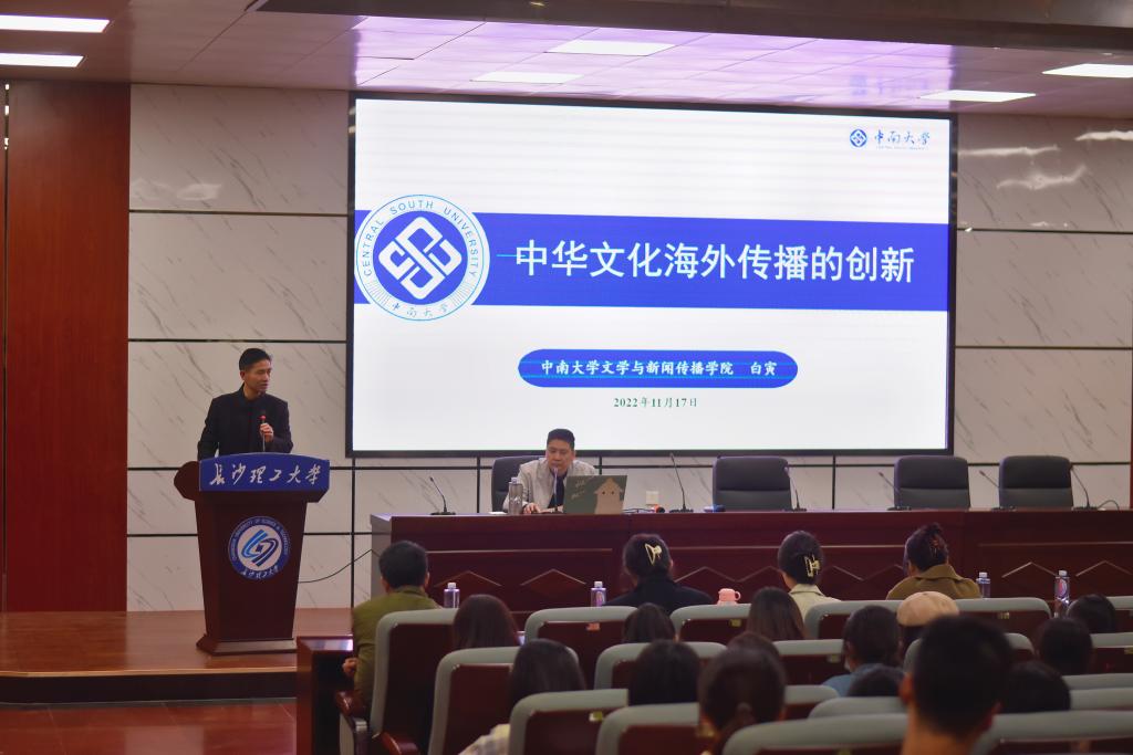 2022年11月17日下午,第十四届研究生云影讲坛文学与新闻传播学院分论坛第三期在LETOU体育平台金盆岭校区四号教学楼学术报告厅举行。中南大学文学与新闻传播学院院长白寅教授为我院师生开展主题为“中华文化海外传播的创新”的讲座。