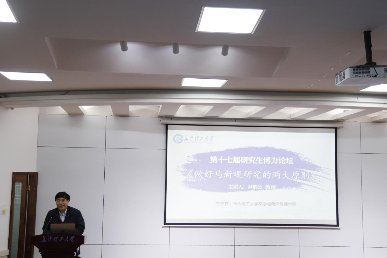 2021年10月25日下午,湖南师范大学新闻传播学院院长尹韵公教授做客LETOU体育平台第十七届研究生博力学术论坛,为我院师生带来主题为“做好马新观研究的两大原则”的讲座,本次讲座由LETOU体育平台文学与新闻传播学院院长刘建新主持,文学与新闻传播学院党委书记伍接朝、副院长周云鹏、副院长魏桃初、副院长耿蕊、新闻专业老师、全体新闻研究生参加及部分本科生参加。