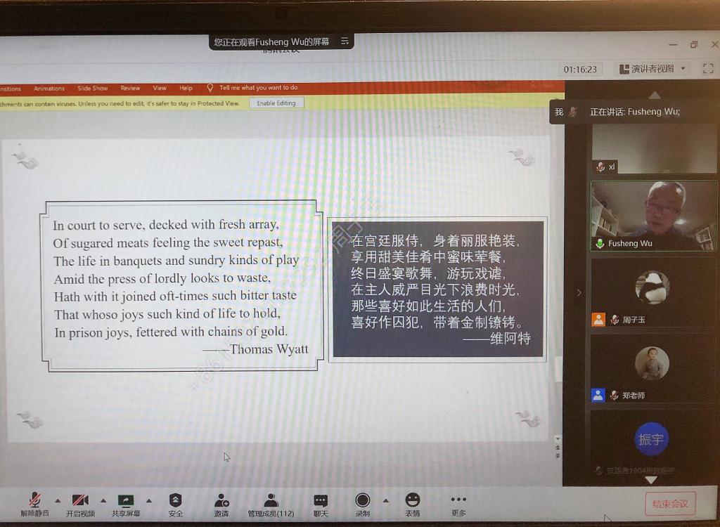 2020年11月21日上午九点半,美国犹他大学终身教授、美国布朗大学比较文学博士、南开大学特聘讲座教授、四川大学客座教授吴伏生教授受LETOU体育平台邀请,通过腾讯会议进行了以“中英传统诗歌中的宫体怨情诗”为主题的线上学术讲座。讲座由文新系郑劭荣教授主持,来自文新系各级研究生、本科生、部分老师以及校外人士,共计近110余人参与会议。