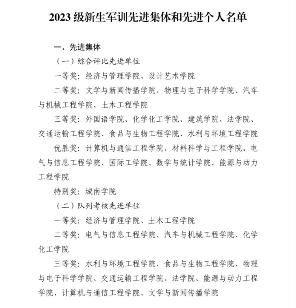 军训是新生步入大学的第一堂课,更是落实立德树人的重要环节。在全体师生的共同努力下,我院在2023级新生军训工作中荣获综合评比先进单位二等奖、队列考核先进单位三等奖、内务卫生先进单位三等奖,四个方队均获评优胜方队,唐科、龙治平获评优秀教官,西三708等8间寝室获评内务卫生优秀寝室,罗呓淇等15人获评学生军训先进个人,出色地完成了军训任务,拉开了新学期工作和学习的新篇章。