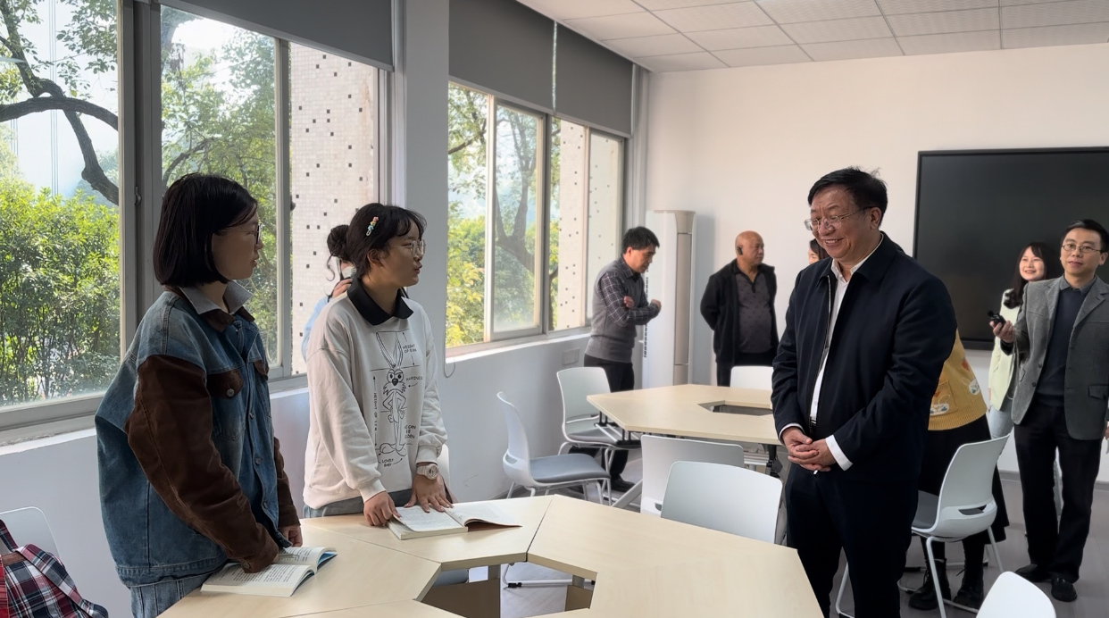 在团体辅导室,付宏渊与学生亲切交流,询问学习生活情况。他高度肯定学院将风景最好的房间用于学生成长辅导,充分践行了“以学生为中心”的育人理念。