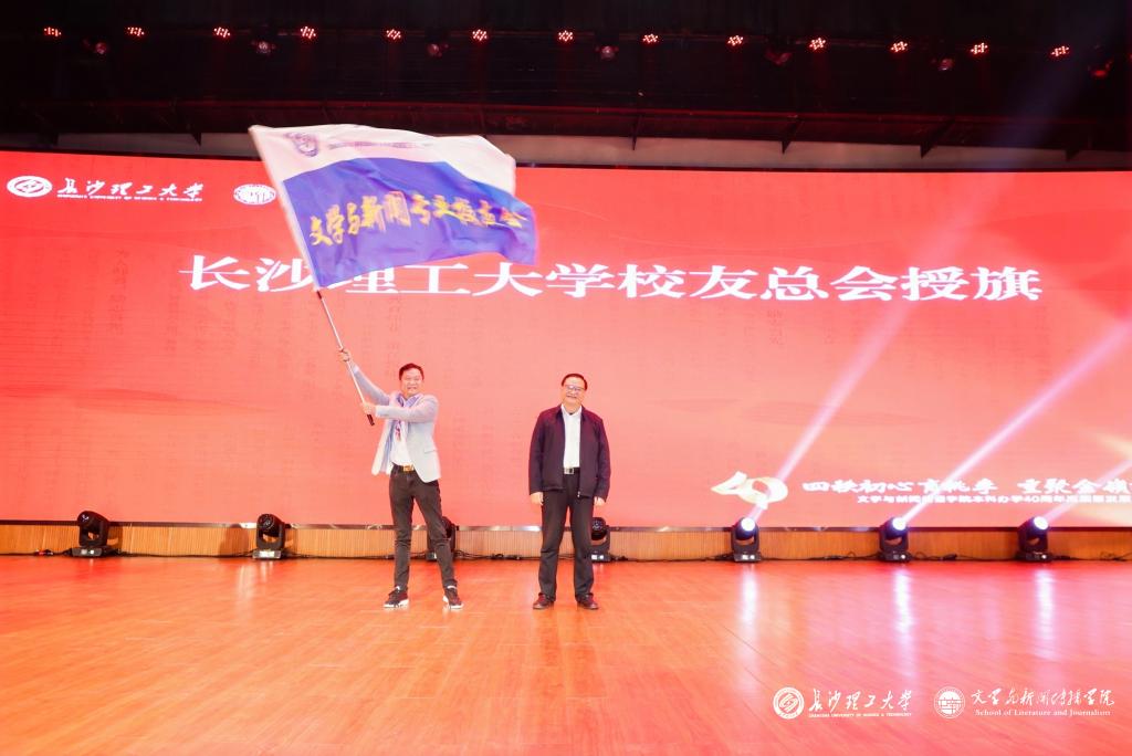下午,在学院本科办学四十周年高质量发展大会上,刘朝晖副校长为文学与新闻专业校友会授旗。执行会长、汉语言文学专业87级校友刘原代表校友会接旗并发言,向母校致以最诚挚的感谢,并代表广大校友表示坚定支持学院的建设和发展。