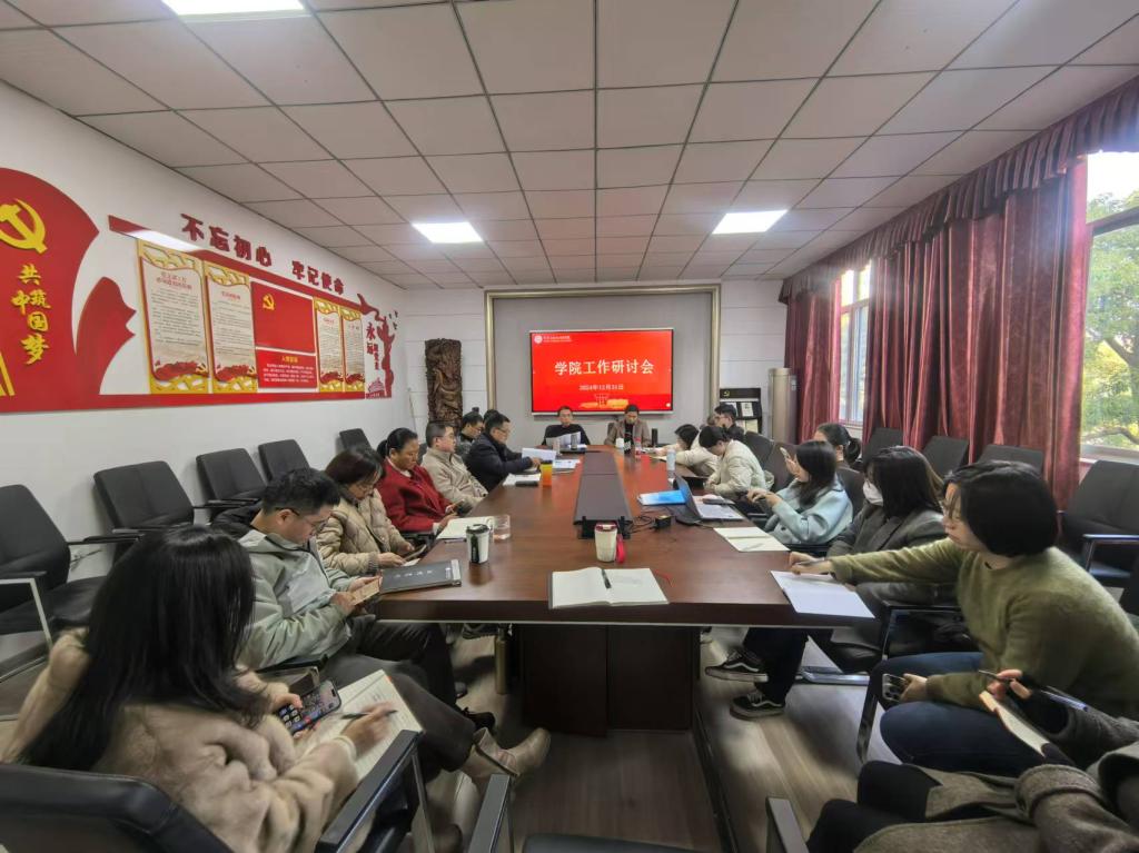 12月31日下午,学院在院会议室召开学院工作研讨会,深入思考当前学院发展面临的重点难点问题,系统谋划2025年学院改革的战略举措和重大任务。学院党政班子成员,各系(室、站、中心)负责人、各教工党支部书记参加会议。会议由院长刘建新主持。