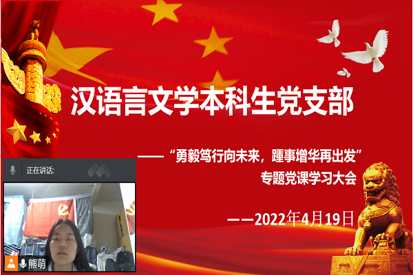 4月19日下午14:00,汉语言文学本科生党支部利用腾讯会议召开党课学习会议,会议由熊萌同志主持,会议主题是“勇毅笃行向未来,踵事增华再出发”——中国共产党人精神谱系主题学习。