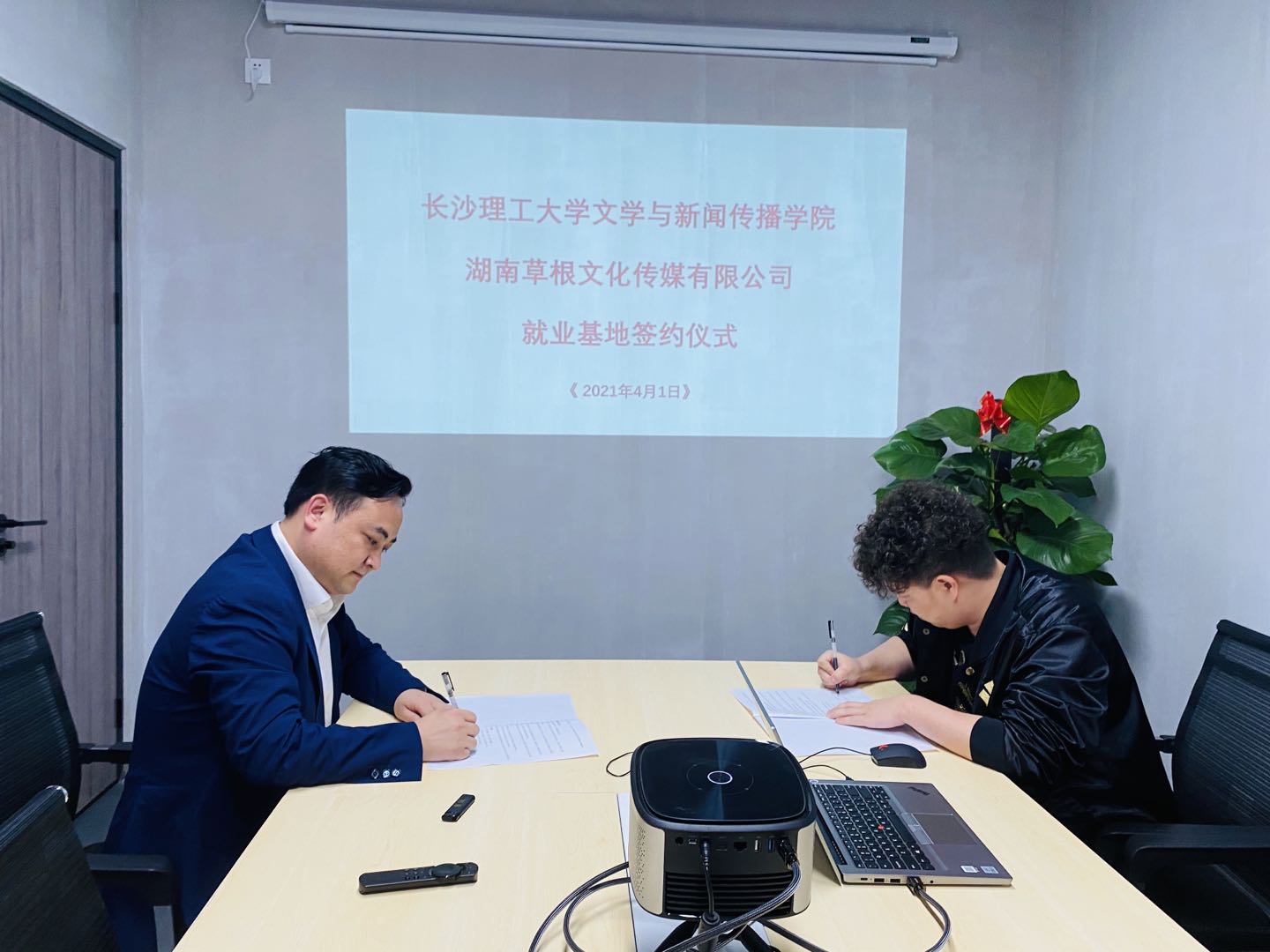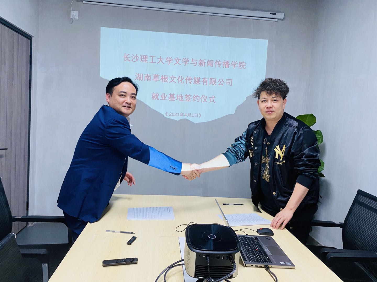 最后,伍接朝与段明签订了学生就业基地协议并合影留念。(文、图/陈鑫宇  审/伍接朝)