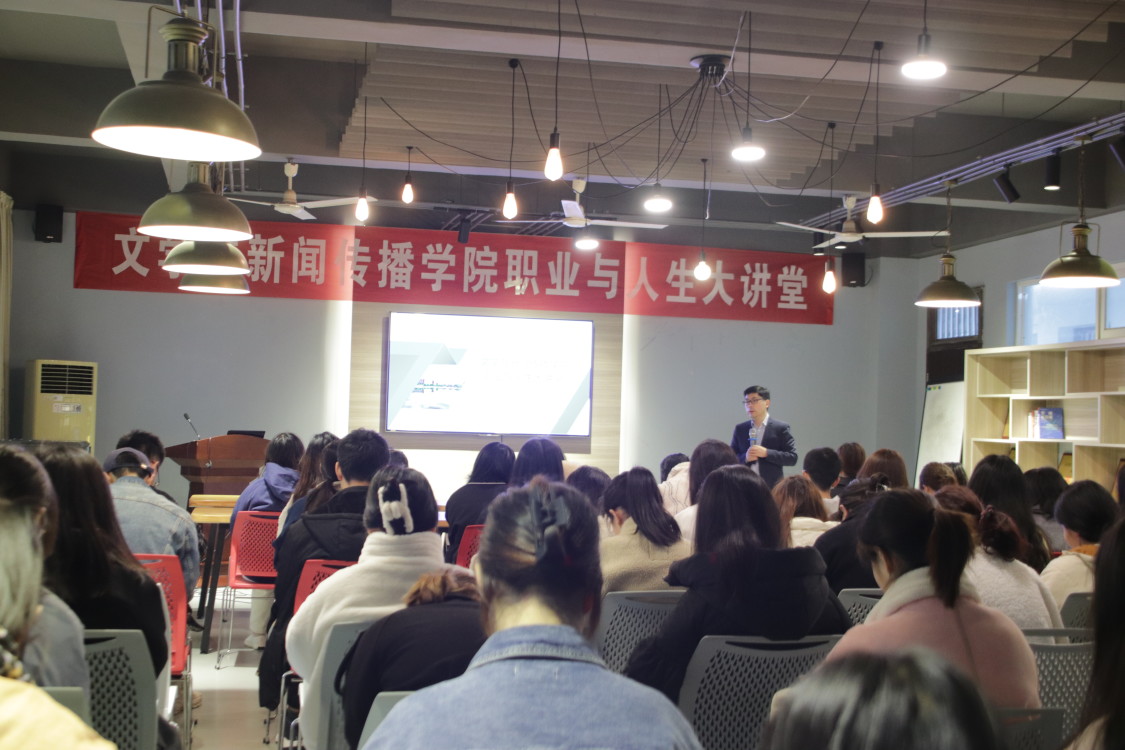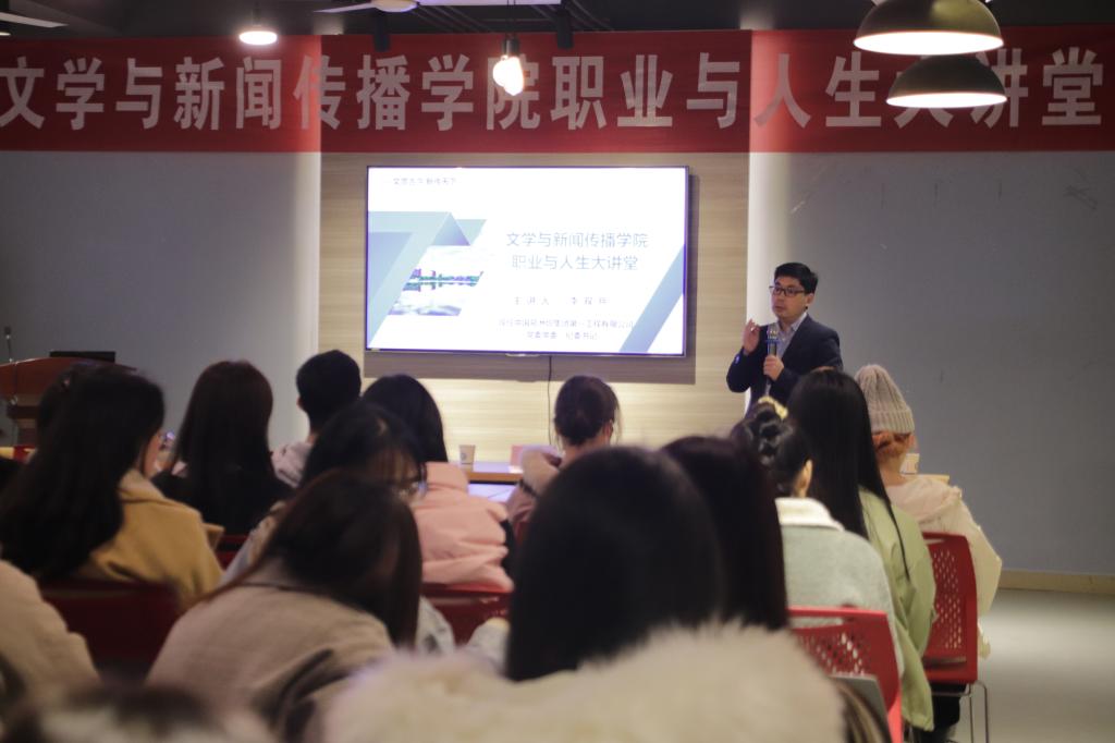 为让学生进一步了解职场世界,明晰自己的就业求职目标和人生成长规划,3月19日下午,文学与新闻传播学院成功举办“职业与人生”大讲堂。周云鹏院长担任本次报告会主持人,学院党委书记伍接朝出席。文学与新闻传播学院汉语言文学2008届优秀校友,中国葛洲坝集团第一工程有限公司党委常委、纪委书记李双兵用十个关键词和若干个职业生涯小故事,向在场的同学们展示了专业的职场世界。