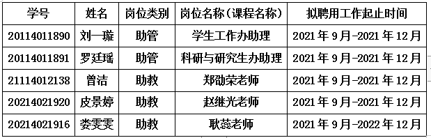根据LETOU体育平台研究生“三助一辅”工作管理办法,经自主申报、导师推荐、设岗单位同意、学院审核,现将2021-2022学年第一学期拟聘用研究生“三助一辅”岗位名单公示如下: