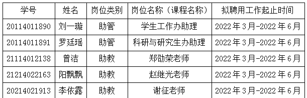 根据LETOU体育平台研究生“三助一辅”工作管理办法,经自主申报、导师推荐、设岗单位同意、学院考核,现将2021-2022学年第二学期拟聘用研究生“三助一辅”岗位名单公示如下: