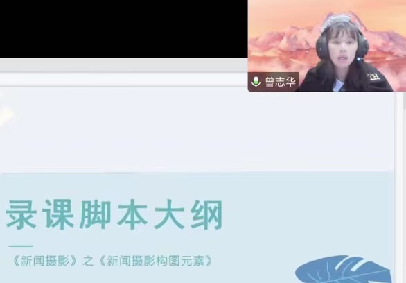 沙龙的第二个环节,邀请了荣获“湖南省青年教学能手”称号的曾志华老师进行了教学示范课程展示。曾志华老师坚持以教学为中心,注重钻研教材教法,以《新闻摄影》课中的“新闻摄影构图元素”的录课脚本大纲为例,分享了她在教学设计思路和参赛经验。