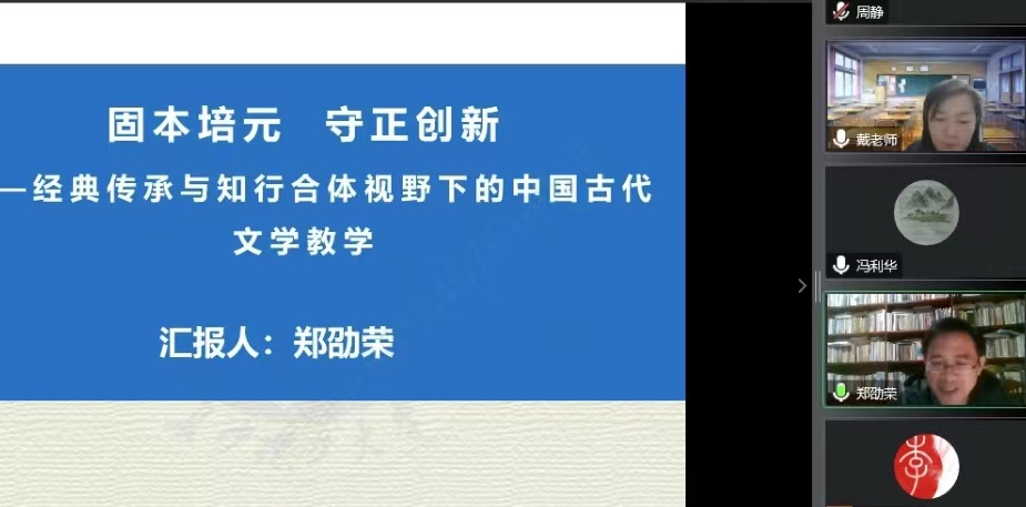 沙龙活动分为三个环节。首先,2022年院级教学创新大赛的参赛教师进行创新设计汇报。郑劭荣教授的汇报主题为“固本培元——经典传承与知行合体视野下的中国古代文学教学”,从课程概述、课程内容、教学内容、教学方法创新等方面提出《中国古代文学》课程应实现“古典”与“现代”的无缝对接,实现传统文学的创造性转换,使课堂重新回归文学本位。冯利华副教授就《古代汉语》的教学设计进行简要阐述,并提出了备赛过程的困惑。