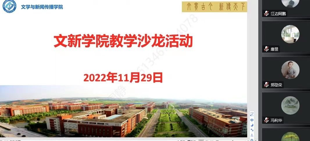 2022年11月29日19:30,文学与新闻传播学院举办了2022年线上教学沙龙活动,活动主题为“教学竞赛经验研讨与交流”。院长刘建新、副院长周云鹏、副院长魏桃初以及学院部分教师30余人参加了此次活动,副院长戴钰主持。