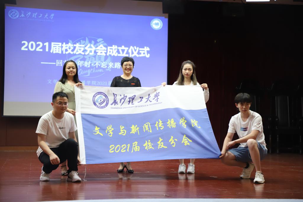 王静琦老师为文学与新闻传播学院2021届校友分会授旗,文学与新闻传播学院2021届校友分会会长王舒琦、副会长张雨豪、秘书长叶婷、副秘书长杨诗峻上台接旗。
