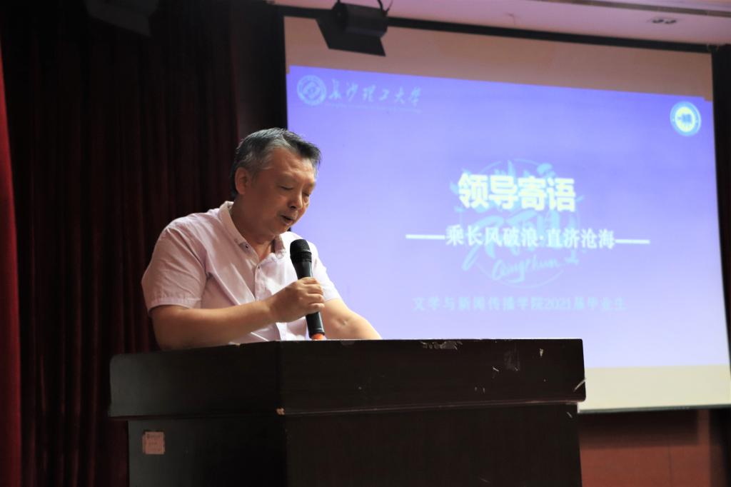 文学与新闻传播学院副院长周云鹏教授致毕业词,祝贺大家顺利毕业。周院长强调,所有毕业生们应当为我们党、我们社会、我们国家的建设贡献自己的力量,也要为文新校友奉献出自己的一份力,无论是待人还是接物要具有人文情怀。同时周院长也指出,坚持和执着是时代需要的品格,坚持做一个有底线、善良的人,保持内心的纯真,人生路在某种意义上才真正开始,以后的路要靠自己努力。最后,周院长寄语所有毕业生:所占之地,皆为天地;所为之事,必为理想。你们如何,文新学院未来就如何。祝福所有毕业生全部步步高升,一路顺风。