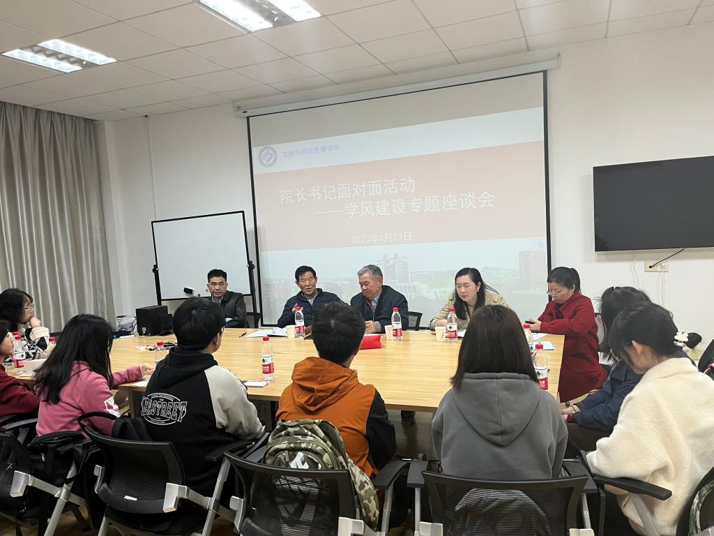 树学风,争优先。为切实加强学校学风建设,夯实“学在长理”工作内涵,促进优良学风形成,我院在4月24日金盆岭7教316会议室开展“院长书记面对面”学风建设活动。会议由学院副院长戴钰主持,关工委主任王乃厚、学院关工委老师潘子初、新闻系主任赵继光、中文副系主任周静、科研办主任刘可、辅导员吴笛及10余名学生代表参与。