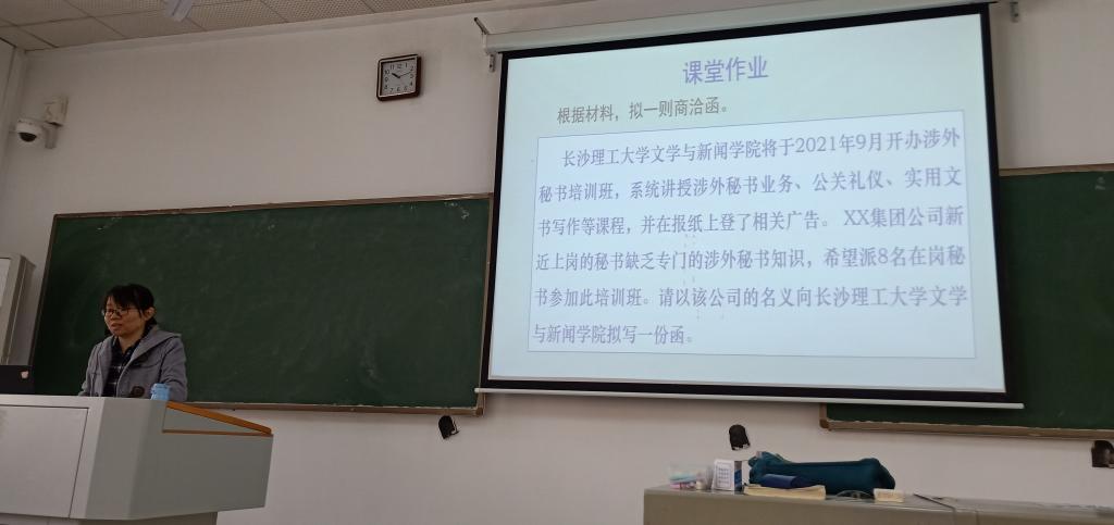 4月9日上午,新进教师黄楚蓉在综教B107上了一堂“大学应用语文”公开课。上课伊始,黄老师首先就上节课学生的作业存在的问题进行了细致分析,列举了一些典范性案例,提醒学生注意常犯的错误。然后她就上节课所讲的报告和这节课即将要讲的请示在三个方面进行了细致区别。最后黄老师详细讲述了请示的定义、特点、类别、写作方式及写作要求。在教学过程中,黄楚蓉老师教姿教态落落大方,语速适中,用语简洁,教学重点突出,教学节奏把握较好,充分利用了现代化教学工具,且通过讲练结合的方式调动了学生积极性,师生互动良好。