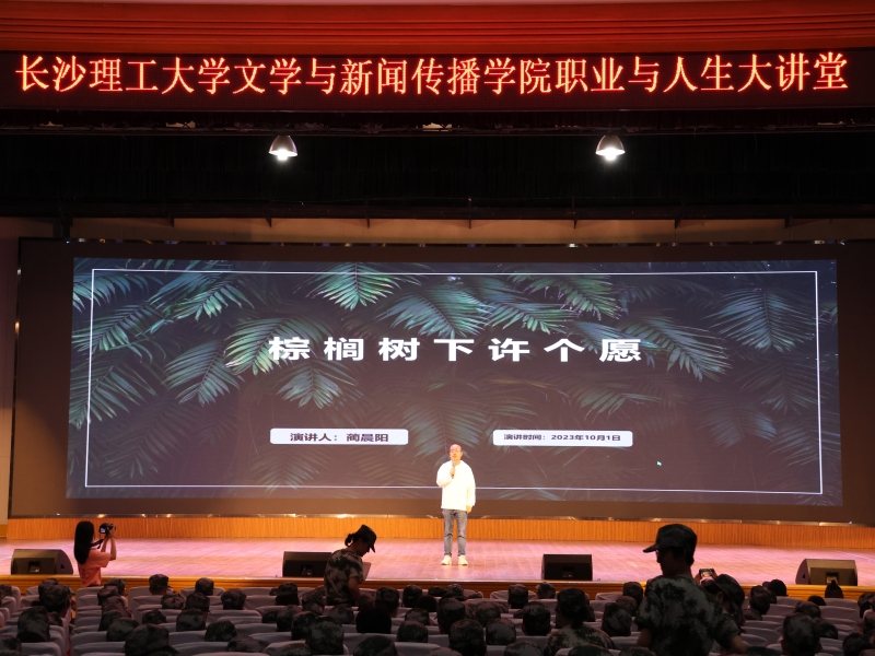 2023年10月1日上午10点,文新学院在金盆岭校区五教大礼堂举行“职业与人生大讲堂”,邀请2011届新闻学专业校友蔺晨阳导演回校分享他的大学成长及职业发展经历。学院2023级全体新生参加。