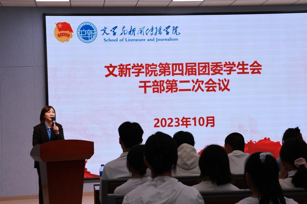 10月20日晚,文新学院在金盆岭校区9教1楼多媒体教室举行第四届团委学生会第二次全体大会,院团委书记李婵、第四届团委学生会干部及全体实践团成员参加。