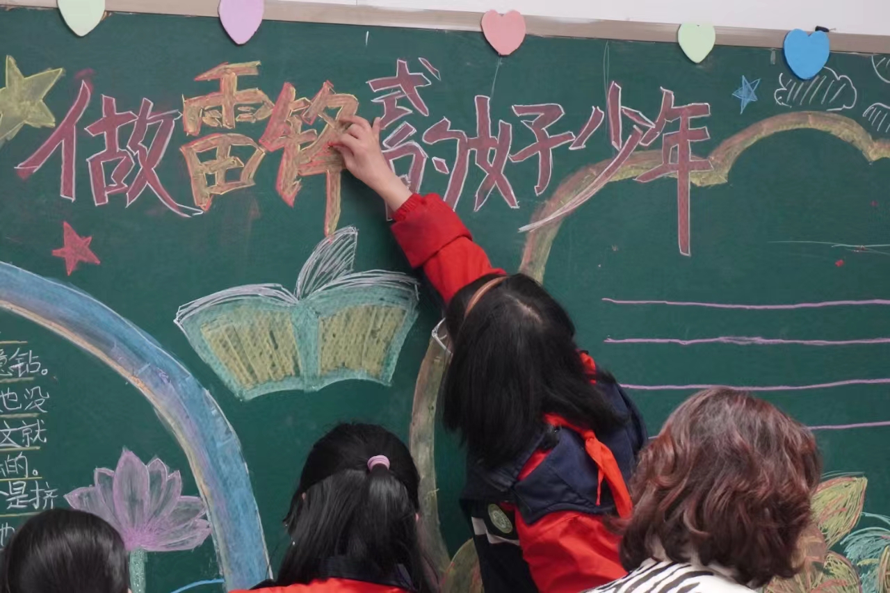 此外,志愿者们还和同学们合作,共同绘制了“做雷锋式的好少年”主题黑板报。志愿者们搭好框架,同学们书写填色。这不仅锻炼了学生们的动手能力,还让他们在这个过程中更加深刻地理解到了雷锋精神的具体内涵。