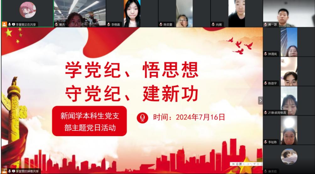 为深入推进主题教育,感悟思想伟力,严格落实“三会一课”,夯实支部“一月一课一片一实践”活动要求,2024年7月15-18日,文新学院各学生党支部开展以“学党纪悟思想,守党纪建新功”为主题的7月党日活动。
