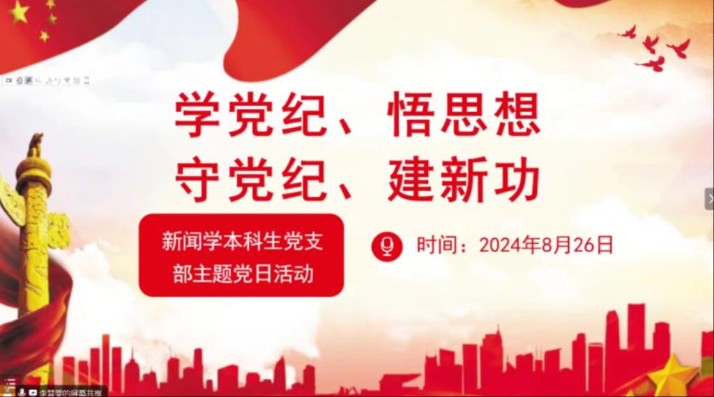 为深入推进主题教育,感悟思想伟力,严格落实“三会一课”,夯实支部“一月一课一片一实践”活动要求,2024年8月26-30日,文新学院各学生党支部开展以“学党纪悟思想,守党纪建新功”为主题的8月党日活动。
