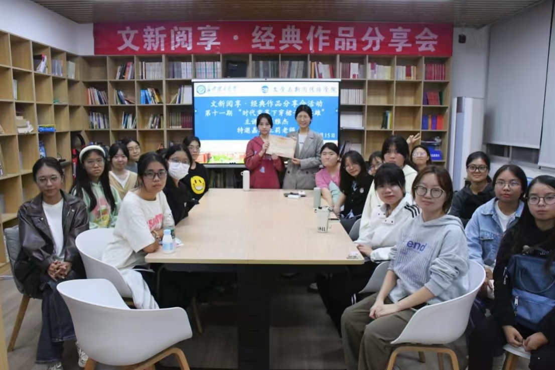 分享会结束后,王莉为刘雅杰颁发“优秀主持人”证书,现场参与者共同合影留念,记录下这难忘的瞬间。本次分享会为大家提供了一个“观点碰撞”的舞台,对于培养学生们的阅读思维以及批判性思维有着切实帮助。