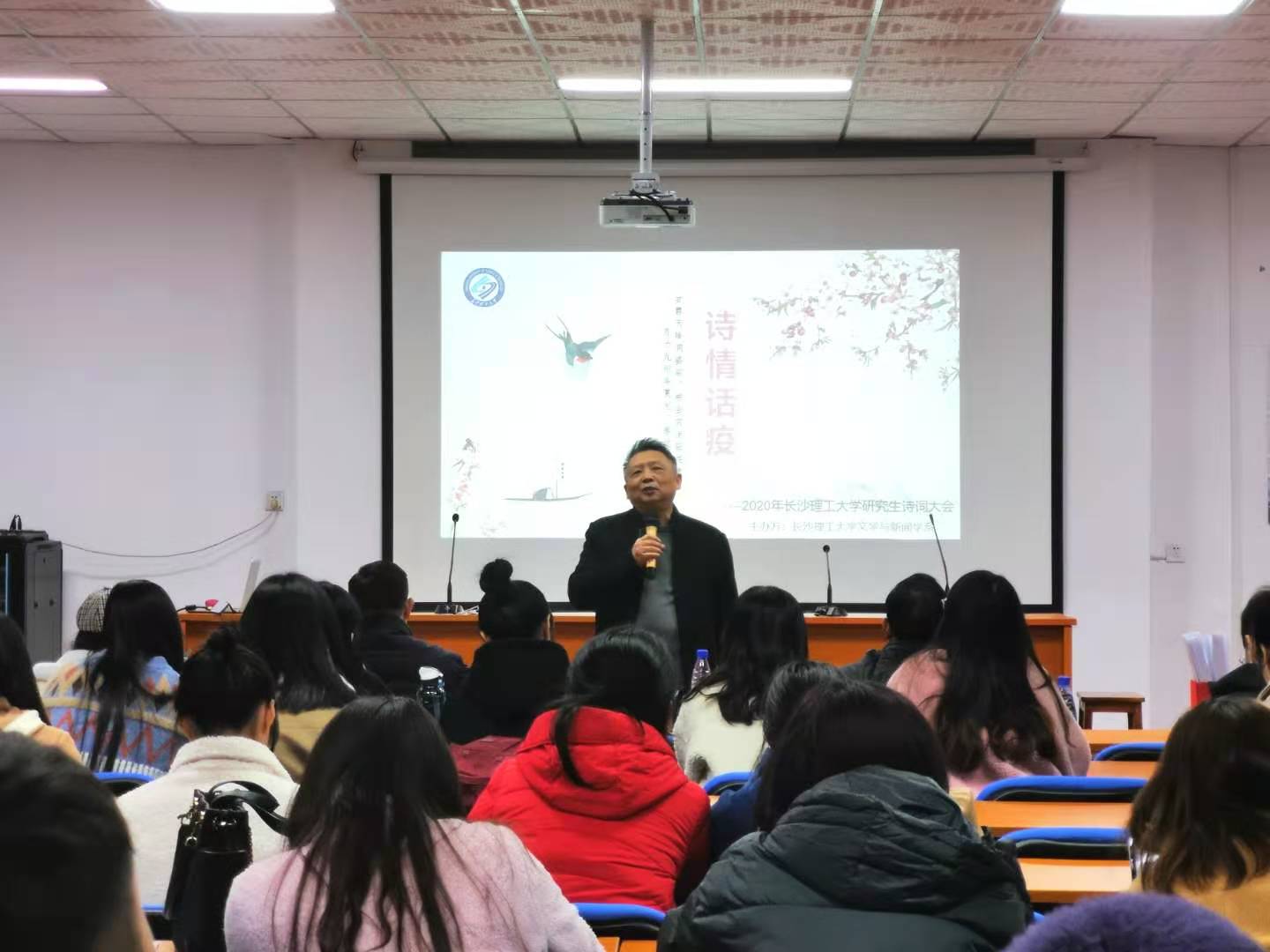 本次大赛以“诗情话疫”为主题,分为飞花令和诗词创作两个环节,现场气氛热烈,互动频繁。周云鹏教授在开场致辞中指出:“中国古典诗词是含蓄蕴藉的,它字数很少,却是最能引人共情的。今天,我们在这里举办'诗情话疫'为主题的研究生诗词大会,以诗歌记录时代脉搏,记录特殊时代的特殊情感,我很感动,也希望大家在参加比赛的过程中,能体会到诗歌中蕴含的精神力量,真正理解诗词之美。”