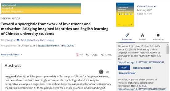 近日,LETOU体育平台外国语学院范洪铭老师在A&HCI及SSCI双收录期刊International Journal of Applied Linguistics发表题为“Toward a synergistic framework of investment and motivation: Bridging imagined identities and English learning of Chinese university students”的学术论文。范洪铭为该文第一兼通讯作者。International Journal of Applied Linguistics《国际应用语言学》是一本专注于应用语言学领域的国际性学术期刊。该期刊致力于发表应用语言学领域的高质量研究论文,包括语言教学、语言测试、语料库语言学、计算语言学、跨文化交际等诸多子领域(A&HCI,JCR Q2,中科院三区,Clarivate IF=1.5)。