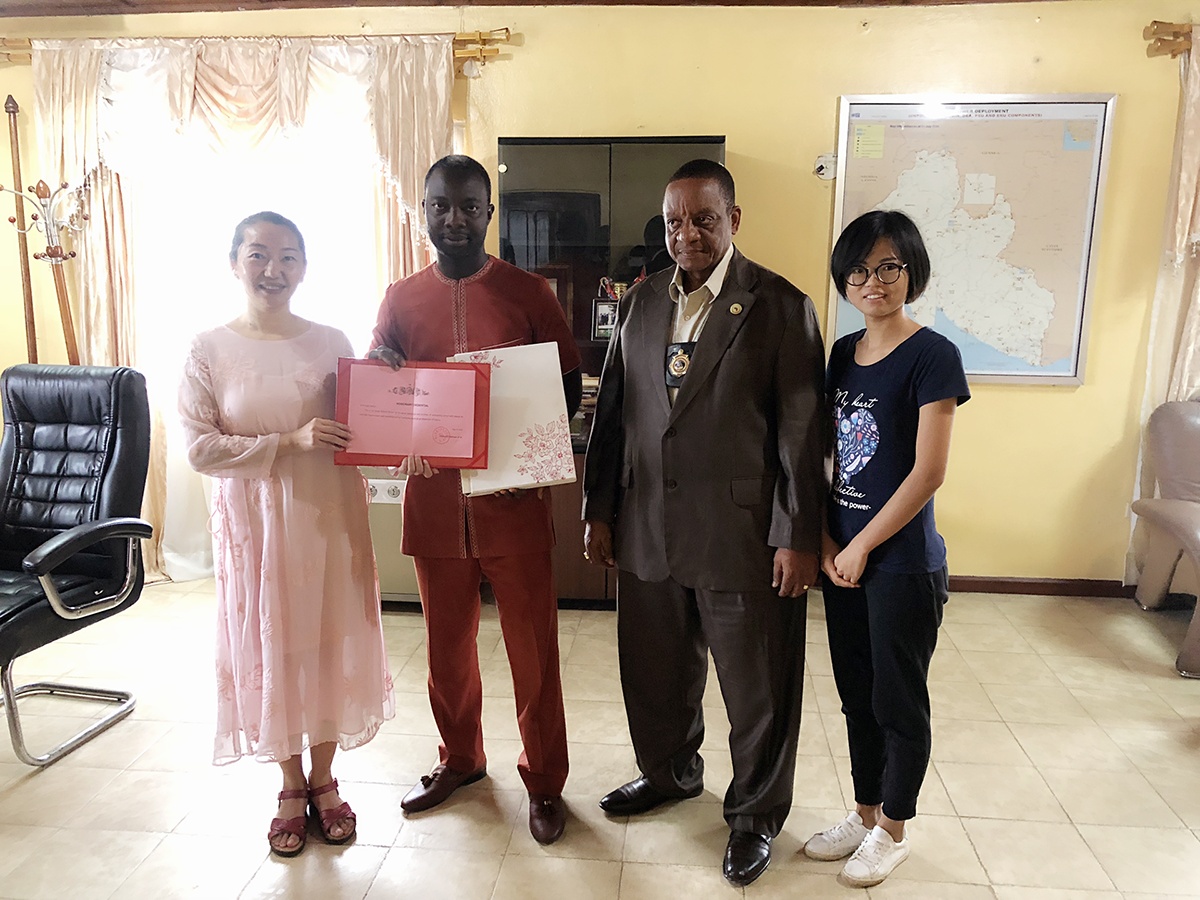 贺润东老师向移民局局长雷密尔·里维斯(Leamuel EA Reeves)详细介绍了事故当天普林斯·塔路(Prince Tarlue)见义勇为的行为。局长认为他的行为值得大力称颂,并号召所有移民局官员向他学习。随后,贺润东老师请局长一起向普林斯颁发了见义勇为荣誉证书和奖品。巧合的是,普林斯也曾是利比里亚大学孔子学院的学员。在2017年,利比里亚大学孔子学院曾给利比里亚移民局的官员开设过汉语班,他曾参加过汉语班学习。此次孔子学院教师代表拜访移民局,也受到了汉语班学员们的热烈欢迎,他们热切地询问汉语班何时再开课,表示希望能有机会继续学习汉语。