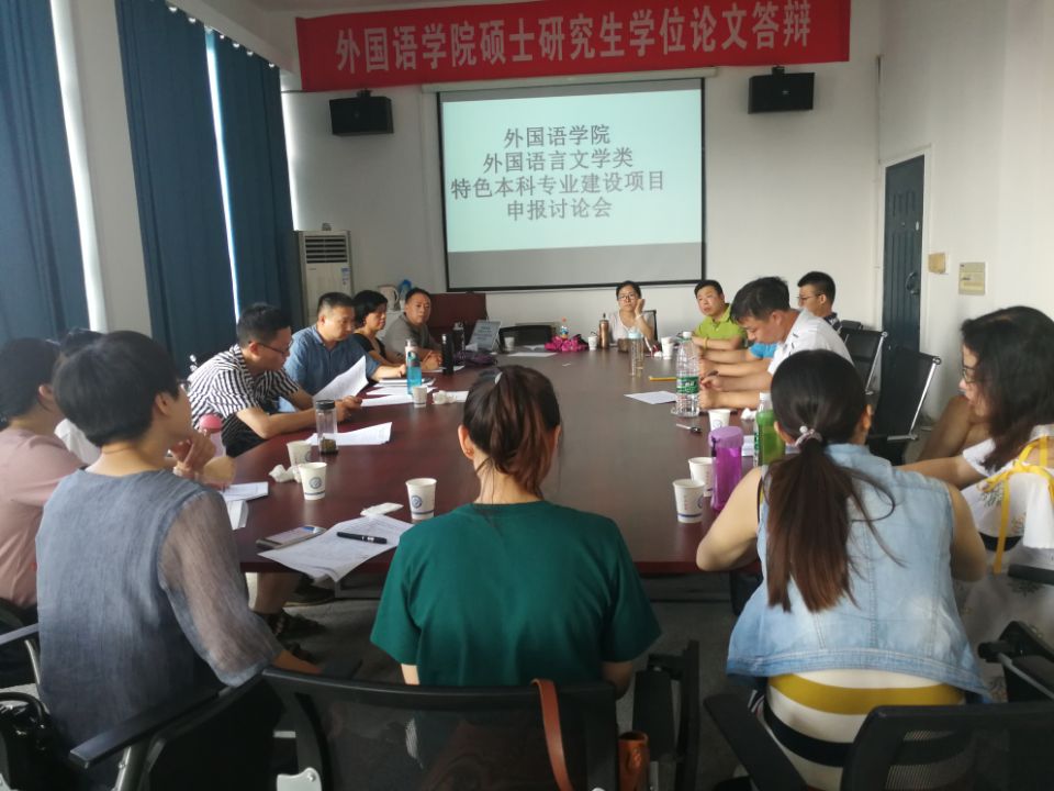 2018年6月27日下午3点,外国语言文学系在金盆岭校区9教406召开了“特色本科专业”申请讨论会。外国语学院院长段胜峰,副院长黄坚、黄月华、武俊辉以及外国语言文学系全体教师参加会议。