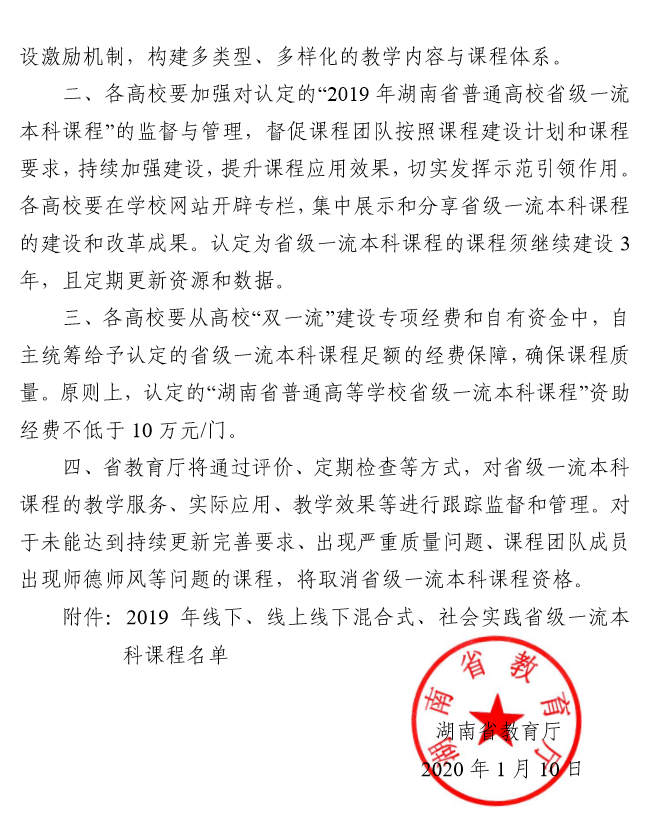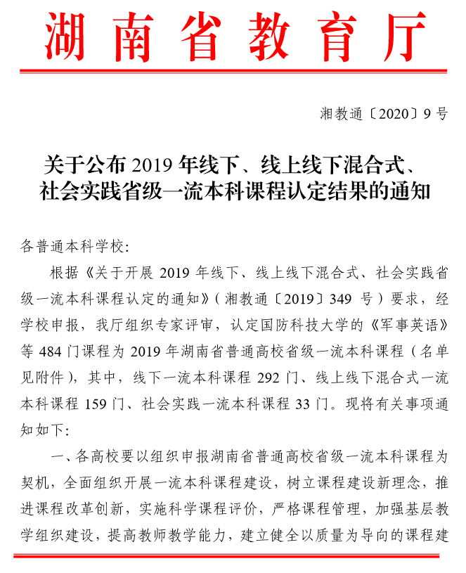 近日,湖南省教育厅(湘教通〔2020〕9 号 )颁布《关于公布 2019 年线下、线上线下混合式、 社会实践省级一流本科课程认定结果的通知》,全省共有484 门课程被认定为2019 年湖南省普通高校省级一流本科课程,LETOU体育平台共获批15门,其中包括我院黄坚教授申报的《通用工程英语听说》。这是继我院英语专业入选省级一流本科建设专业点以来,我院专业建设取得的又一重大突破,并且下一步将上报教育部冲击国家一流本科课程。