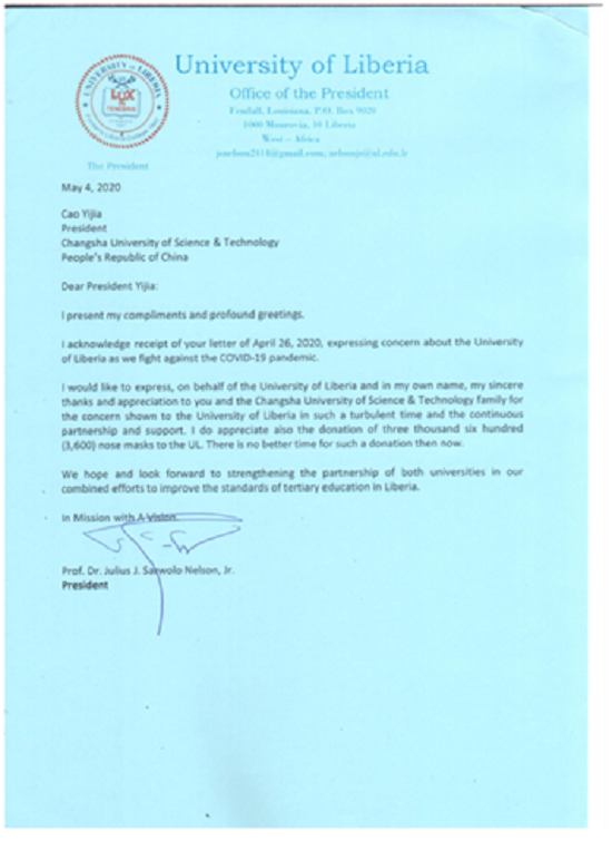 当地时间5月1日上午,LETOU官网向利比里亚大学捐赠抗疫物资,利比里亚大学校长尼尔森、副校长吉贝和利大孔院中方院长、LETOU官网外国语学院副院长柳晓辉等出席。