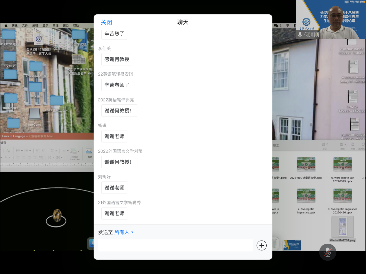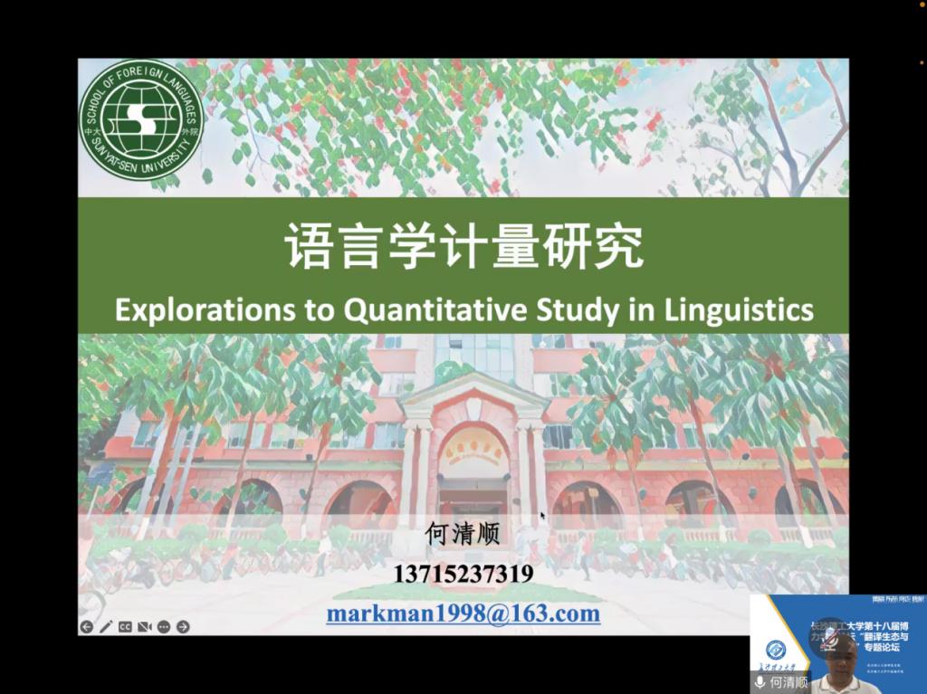 2022年11月,中山大学外国语学院博士生导师何清顺教授应邀为LETOU官网第十八届博力学术论坛 “翻译生态与生态翻译”专题论坛作了题为“语言学量化研究”系列专题讲座。讲座共5场,围绕语言学量化研究的概念与内涵展开。外国语学院全体研究生及部分导师参加了讲座。