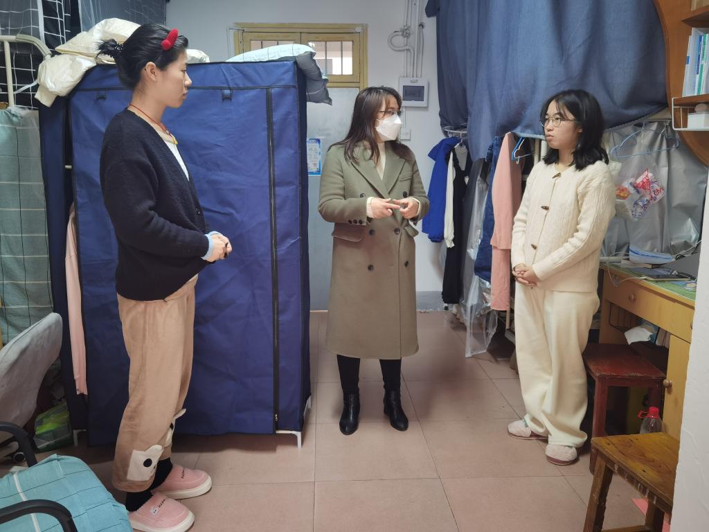 院党委副书记周芳、副院长季红琴、副院长谭莲香、21级辅导员陈若晨、22级辅导员毛婕在金盆岭校区走访看望了大一大二的同学。老师们真切关心每一位大一新生入学后是否适应学校的学习生活、指导卫生打扫及安全用电问题,强调要从低年级起培养良好集体生活习惯。同时,老师们认真了解了大二同学目前的学习生活状况、期末复习情况,叮嘱学生安全用电问题,并提醒大家及时通风预防冬季流感,注意身体健康。