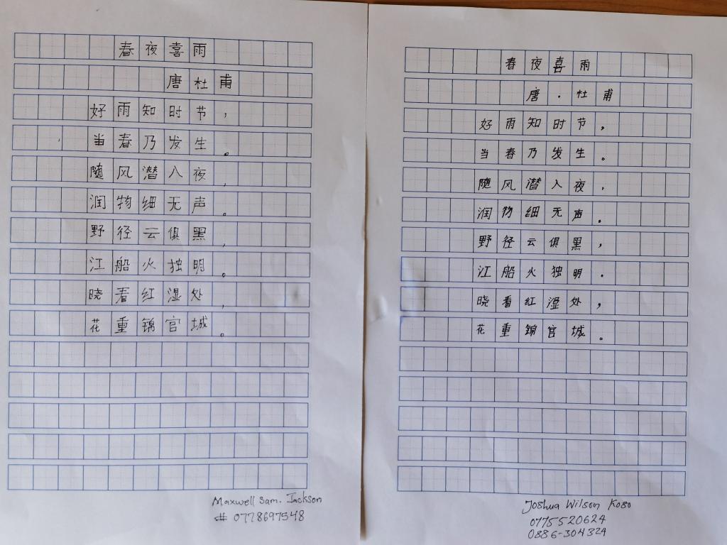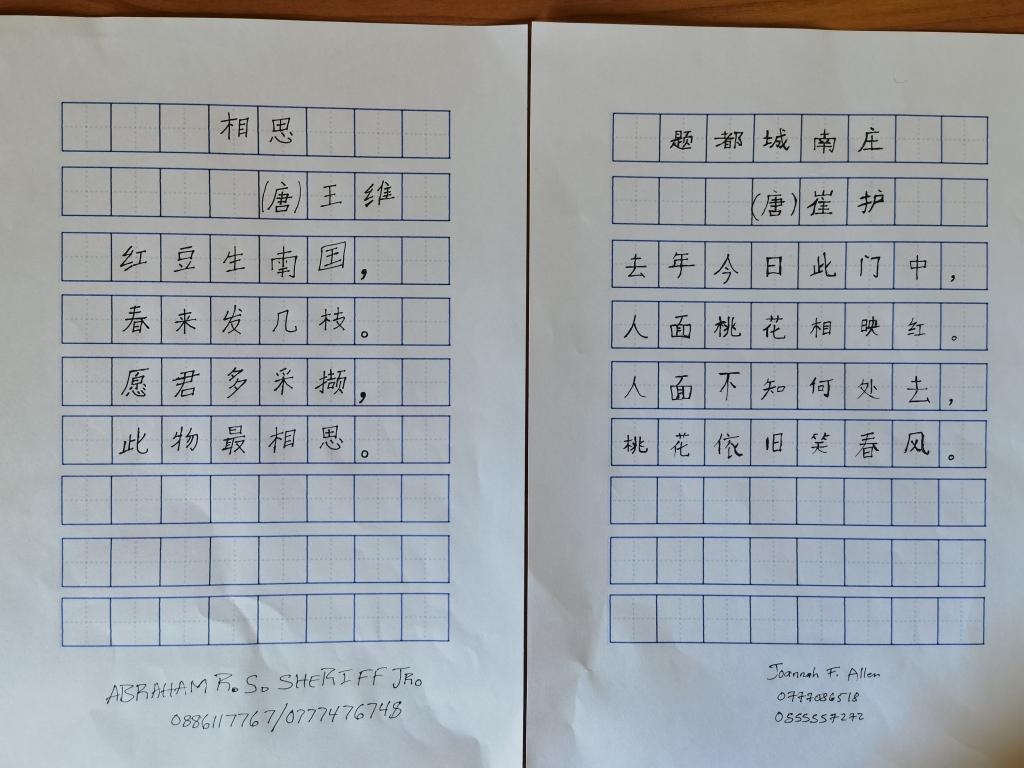 通过这次汉字书写竞赛,学生们不仅更深刻地了解到了汉字书写的精妙,也通过古诗词书写受到了美的熏陶。利比里亚大学孔子学院将再接再厉,通过丰富多彩的活动,帮助学生学好中文,拥抱更美好的未来。