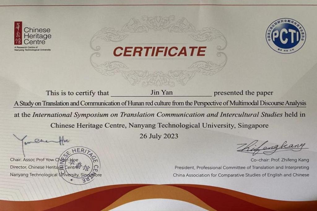 阎瑾老师受邀在国际学术会议上做学术报告,说明近年来我院充分发挥英语国家一流专业建设点和翻译省级一流专业建设点的优势,大力推动湖湘文化国际传播,为讲好中国故事和湖南故事提供智力支持。学校以及学院近年来鼓励师生参加国际学术交流,在国际学术界展现出良好的学术精神风貌和学术素养,营造了浓厚的学术研究氛围,提升了师生的国际视野和学术水平。